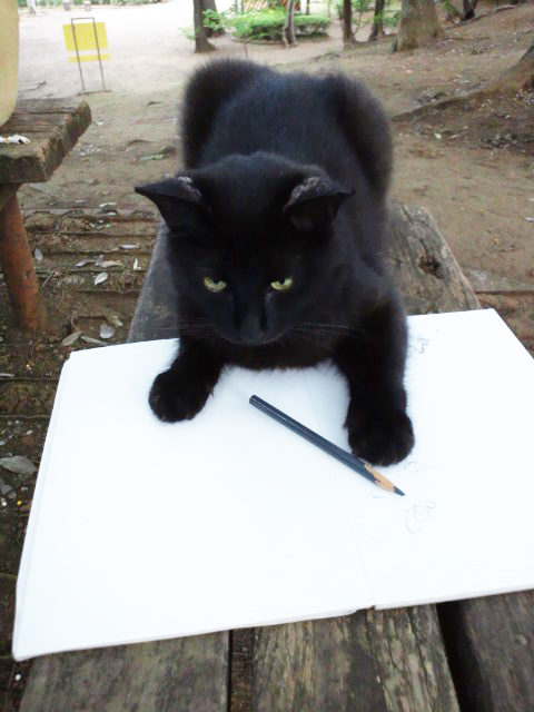 今日(日付が変わったのでもう昨日ですが)、近くの公園で スケッチをしていました。 川沿いにあり、それほど近くに家などがないこともあり、 公園の木陰は思ったより暑くはありません。 ただし、蚊はものすごいです。 むしろ冷房が効きすぎている建物内よりずっといい。 最近、節電はどうしたのでしょうか。 寒いほど涼しくなくても、昼間の電車内に明かりがなくても 全然いいんだけどなぁ。 閑話休題。 そう、この公園は例のねこたちの公園。 お世話をしている方達が日に何人かいらっしゃいます。 写真に写っている発泡酒は、ねこ仲間の方が 「たまたま2本買ったから一緒に呑みましょ〜。」 とくださったものです。ごちそうさまでした! (イラストレーターは毎日のんびり外で呑んでいるわけではありません…) 前日から外でスケッチするぞ〜と決めてはいたのですが、 やっぱりいいものです。これからもたまにしよう。 そろそろ引き上げようという頃に公園に帰って来た子が。 私が描いている手元を「じぃ〜」っと見ているので貸してあげました。 本日のねこ画伯。 そして飽きちゃいました。 それでは! BGM: |