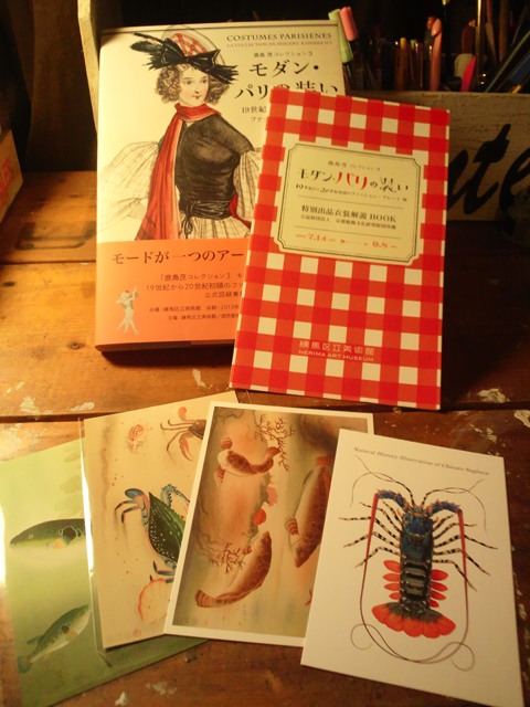書いている途中、間違って消してしまいました、あ〜。 それにしても今日は疲れた〜!! どれくらいかと言うと、パピコのもう半分を食べてしまいたいくらいです。 なぜそんなにぐったりしているかと言うと、 今日は2つの展示を観て来たからです。 1つ目はこちら 鹿島茂コレクション3 「モダン・パリの装い」 19世紀から20世紀初頭のファッション・プレート ホームページやポスターからは、フランス上流階級のファッションが 全面に感じられるかもしれませんが、 私は2階に展示されていた20世紀のイラストレーションの方が断然好きでした。 19世紀が上流階級向けのファッションプレートなのに対し、 20世紀のコーナーには男性向け、子供向けの雑誌の挿絵などもありました。 有名なものだとシャルル・マルタンのこちらなど。 タッチも幅広くなります。 続いては東京ステーションギャラリーでの Art Portfolio of Fishes by Bakufu Ohno 大野麥風展 「大日本魚類画集」と博物画にみる魚たち これはポスターを観た瞬間、繊細で品のある色彩、魚たちの表情に強く惹かれていました。 図録、生活に役立つ学術書の様な用途であるのに、 すべて生きているときの姿で、しかも複数匹で描いている。 本当に好きだったんだろうなぁと、にやにやして観てしまいました。 東京駅という場所柄か、お子様連れの方も多くいらっしゃいました。 一見、『ユルく』も『おかしく』もない絵ですが、 子供たちはとても楽しそうでした。 イラストレーションには「説明する」「明るく照らす」という意味があります。 この絵を観て海で同じ魚を観た時、子供たちはきっと 「あのお魚だ!」とわかるでしょう。 おもしろおかしく崩して「ゆるかわいい」「子供にも喜ばれる」というのは 違うよなぁ〜と思っている私です。 さらに2つの展示はどちらも版画でした。 私個人的にはイラストレーションは複製される事を前提としていると思っています。 モダン・パリの装いのコレクター鹿島茂氏は図録に 「まれに原画を観ると、優れたコピーはオリジナルに勝っていると思う事がある。 彫り氏や刷り氏の職人技が加わってはじめて仕上がるもので、複人芸術である」 と書いておられました。 東京ステーションギャラリーは建物も見応えのあるものでした。 建物自体が重要文化財で、レンガは創建当時のもの、 黒い部分は空襲で焼けたものだそうです。 うだるような暑さと、故郷へ帰る、旅行へ行く人々と、 黒く焼けた部材と、近代的な煌煌と光るライト。 いいものをマジマジと観るとこんなにも疲れるものなのですね。 1版1版の凹凸や顔料の量によって生まれる厚みは やはりパワーが違いました。この状態で複製される版画はすばらしいですね! BGM:Maga Dog /Peter Tosh