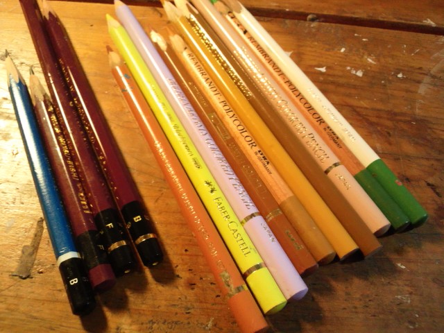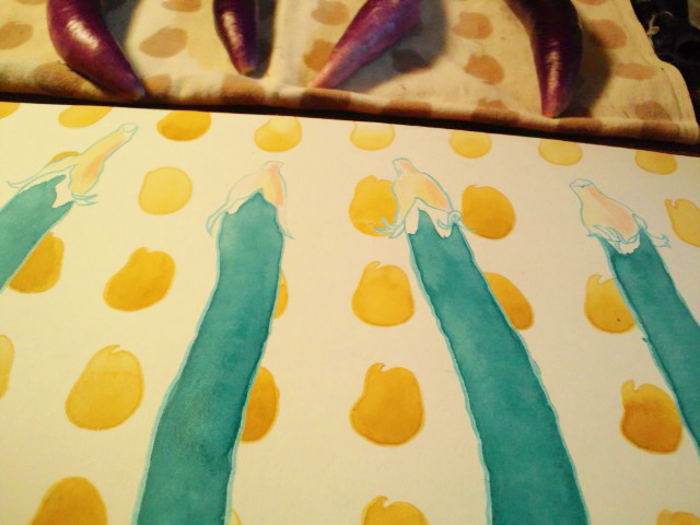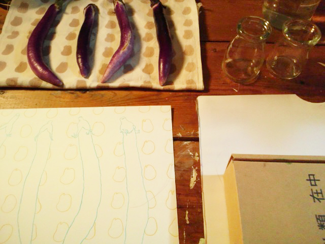 毎日毎日暑いですね!それが夏ですよね。 私はお昼休憩か、朝の遅めの散歩のついでに買い物をする事が多いのですが、 そうすると地元のお野菜を買う事ができます。 はっとするほど鮮やかな色で、思わずぱしゃり。 地元野菜コーナーには、他の地方から運ばれてくるパッケージされた お野菜とは少し違った形のものなどあって、目にも楽しいものです。 こういうものはモチーフにしたくなりますね! この小降りなピーマンくらいのサイズのものは甘ししとう、 なすはとてもすらりとしたものでした。 イエローカレーにして美味しくいただきました、ごちそうさま。 話変わって今日は制作風景を。 窓を開け、それほど暑くない日は作業に入るとレゲエを小さく流しています。 って、モチーフにしてるじゃん!図案の思案、画材の実験中。 水彩絵の具、インク、アクリルガッシュ、リキテックス、色鉛筆、クレパス、ペン、 版画にPCに…出したり仕舞ったりは面倒ですが、 それぞれに得意分野があります。 こちらは色鉛筆と鉛筆。 鉛筆は断然uniのFから2Bが使用頻度が高い。 色といい、柔らかさといい、好きなんです。 色鉛筆はMITSUBISHI、LYRA、Faber-Castell(ファーバーカステル) TomboやSTAEDTLERの水彩色鉛筆などがありますが、 Faber-Castellが一番多く、この中では1番芯が柔らかい気がします。 一番こだわりのある黄土色系と緑系にLYRAが。 黄土色は本当に微妙な色違いで何本もあります。 だからなんだというお話でした。 お仕事と並行しつつ、このように新しいイラストや図案を描いている Mamedoriでした〜。 BGM:
