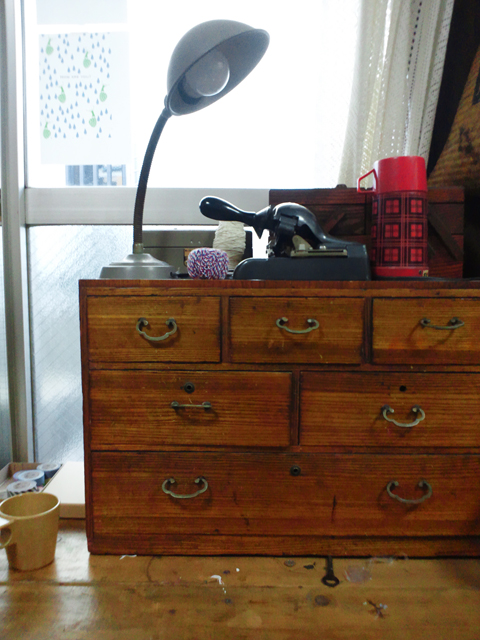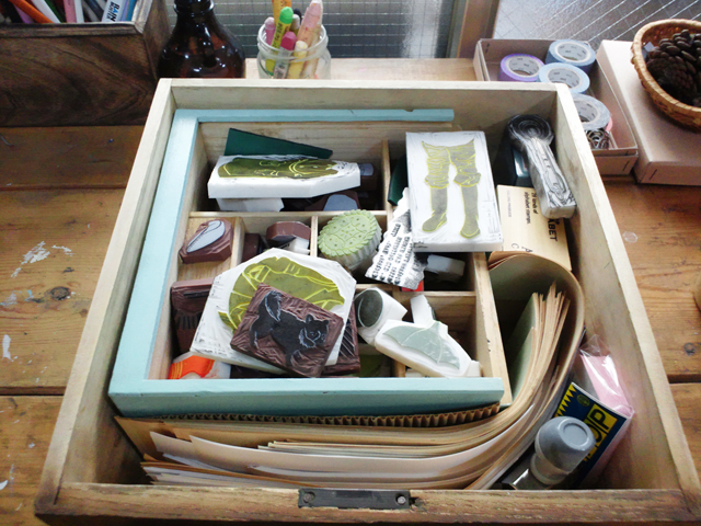 連休初日の方も多いのではないでしょうか。 さて今日は、作業風景とそのまわりの古道具をご紹介いたします。 彫刻刀が入っているのは蛇の目ミシンの古いツールケース。 こちらはもう何年も前に蚤の市のような所で購入。 MAMEDORI LABO.の商品のストックやスタンプ、 小さな紙などが入っている古い桐の引き出し。 こちらはガレージセールで購入。 ちなみに引き出しの上に載っているものもすべて同じお店。 古いライトにナンバリングマシン、木の裁縫道具入れ(中は革道具)に aladdin(アラジン)の水筒、引き出しの脇にはKENROのマグカップ。 この水筒はこれのモチーフになりました。 上から2番目です。(こちらの商品は直接お問い合わせ頂けると幸いです。) かなりの数になってきたスタンプ達。 奥に見える色鉛筆立てはマンゴーの木で出来たものでこちらは今のもの。 こんな感じでせっせと彫っています。 最後に、今年に入って何だかずーっと気になっている藍色。 夜はまだ冷えますね。それでは! BGM:James Brown / Think